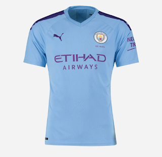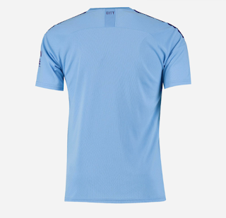 Áo sân nhà của Manchester City 2019-20 có màu xanh da trời với logo màu tím ở mặt trước và một dải màu tím chạy xuống tay áo.