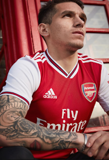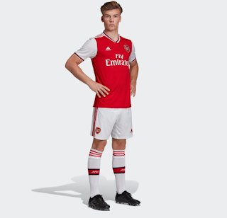 Mẫu áo sân nhà của Arsenal 2019-20 được kết hợp giữa thân màu đỏ truyền thống và tay áo trắng của Arsenal với viền hải quân trên cổ áo và cổ tay áo.
